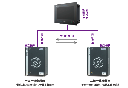 ZLS-2Di二級壓縮低壓機啟動后,由顯控一體機發(fā)出啟動命令,通過高速通訊協(xié)議,確保兩級間的快速響應同時啟動兩臺一體變頻器,變頻器啟動后,由變頻器內(nèi)部控制系統(tǒng)獨立控制各級的壓力變送器直接接在一體變頻器上,壓力讀取、PID響應速度更快,確保能夠快速恒壓。協(xié)調(diào)工作同起同停,任意一臺空壓機停機或出現(xiàn)故障時,另外一臺立即跟隨停機。即便是通訊線斷了,一體空壓機也能獨立保護,根據(jù)傳感器監(jiān)測的數(shù)值,做出保護停機的動作。